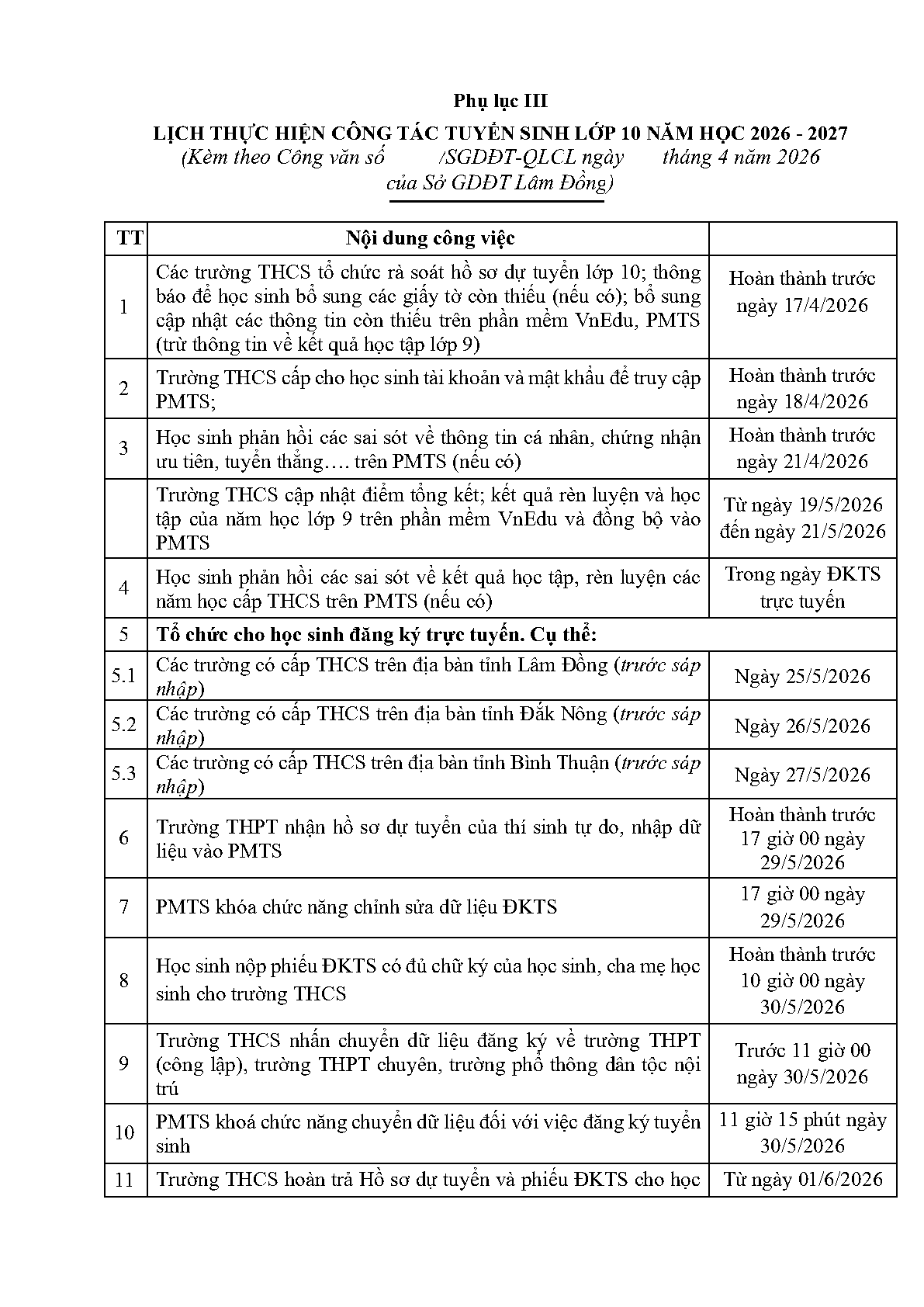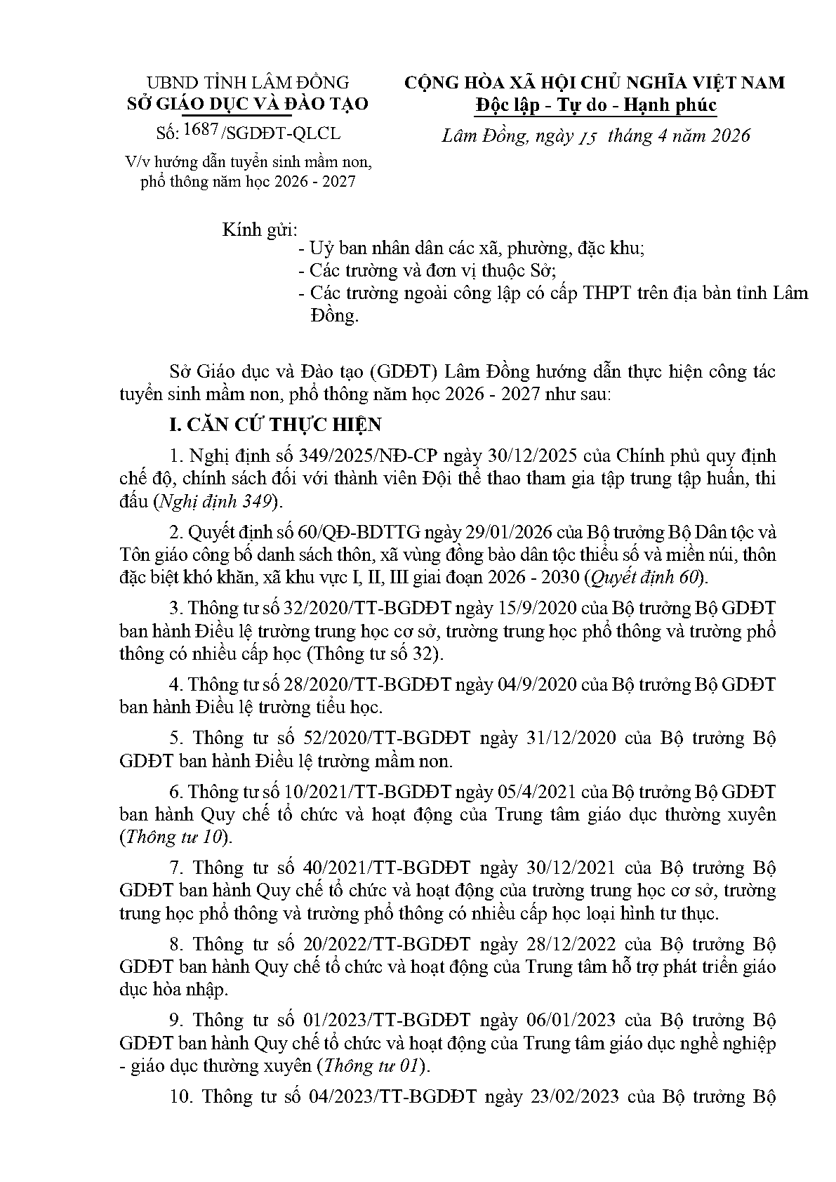 • Quyết định Phê duyệt Kế hoạch tuyển sinh vào trường phổ thông dân tộc nội trú, tuyển sinh vào lớp 10 các trường trung học phổ thông năm học 2026 – 2027 trên địa bàn tỉnh Lâm Đồng (25/04/2026)