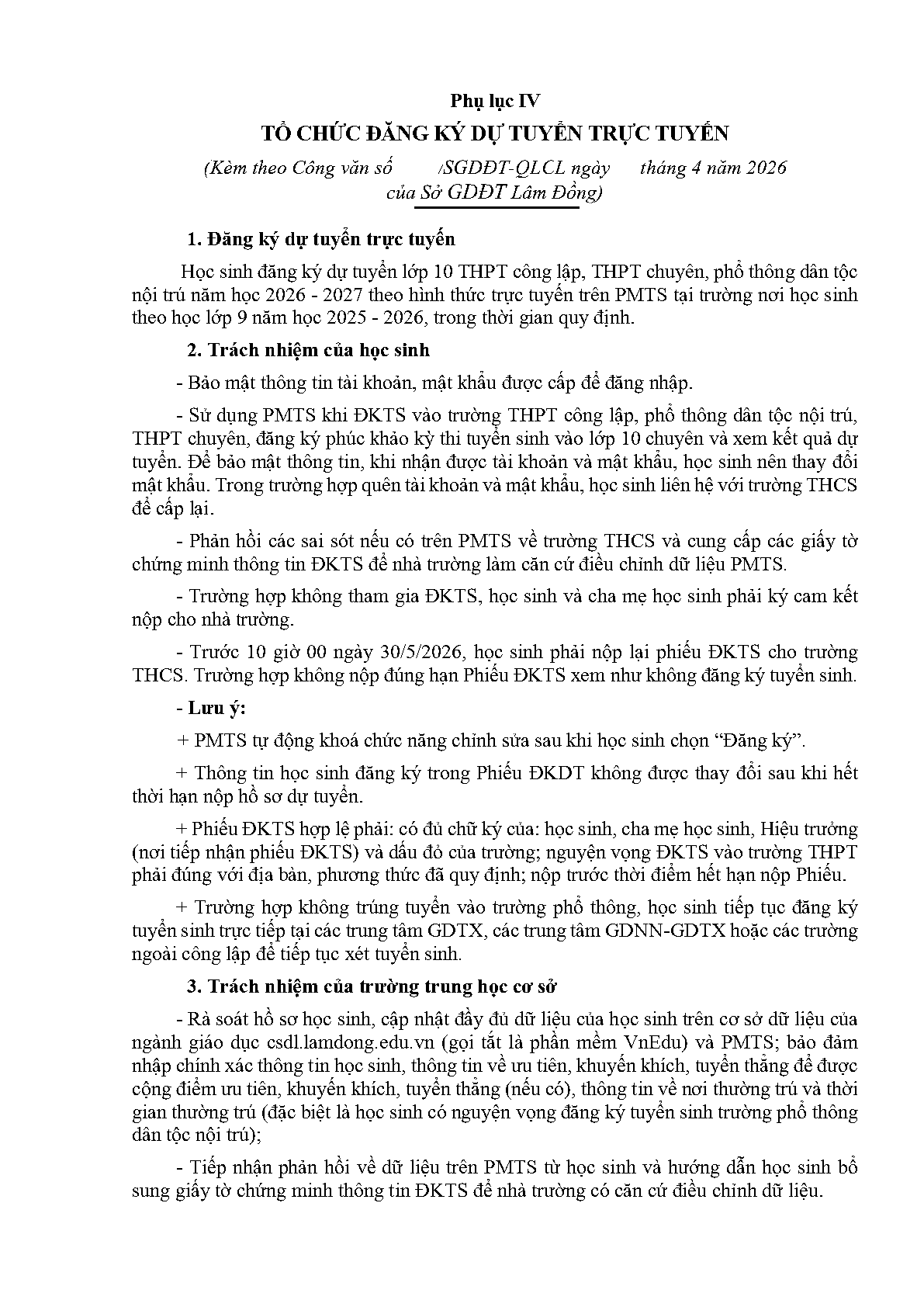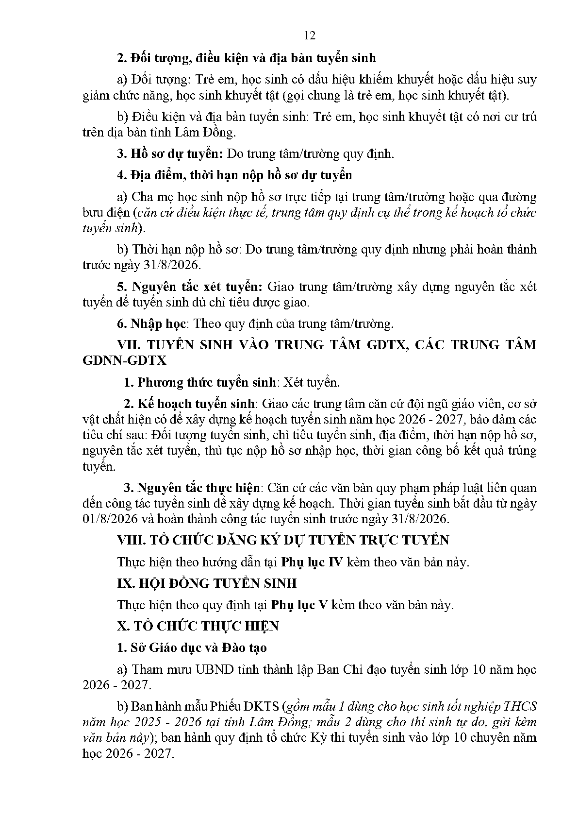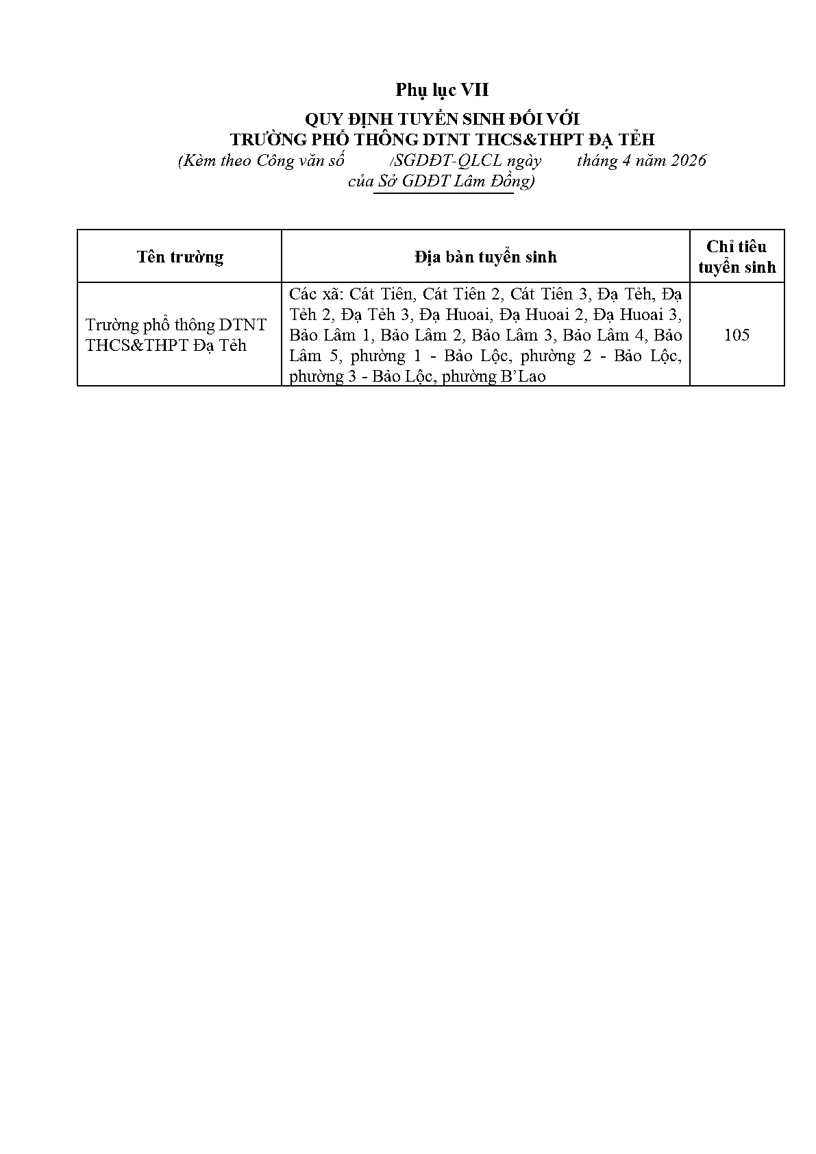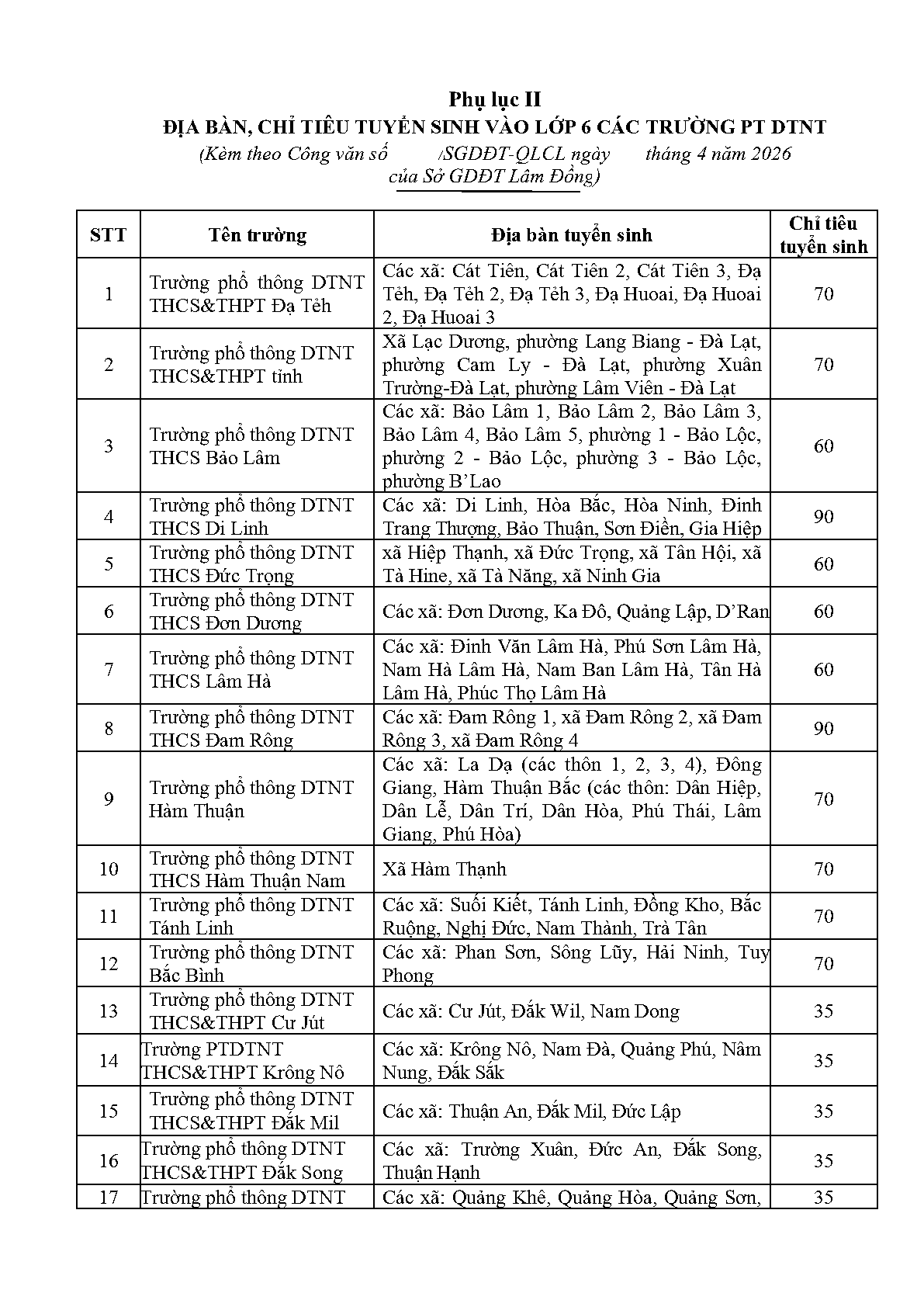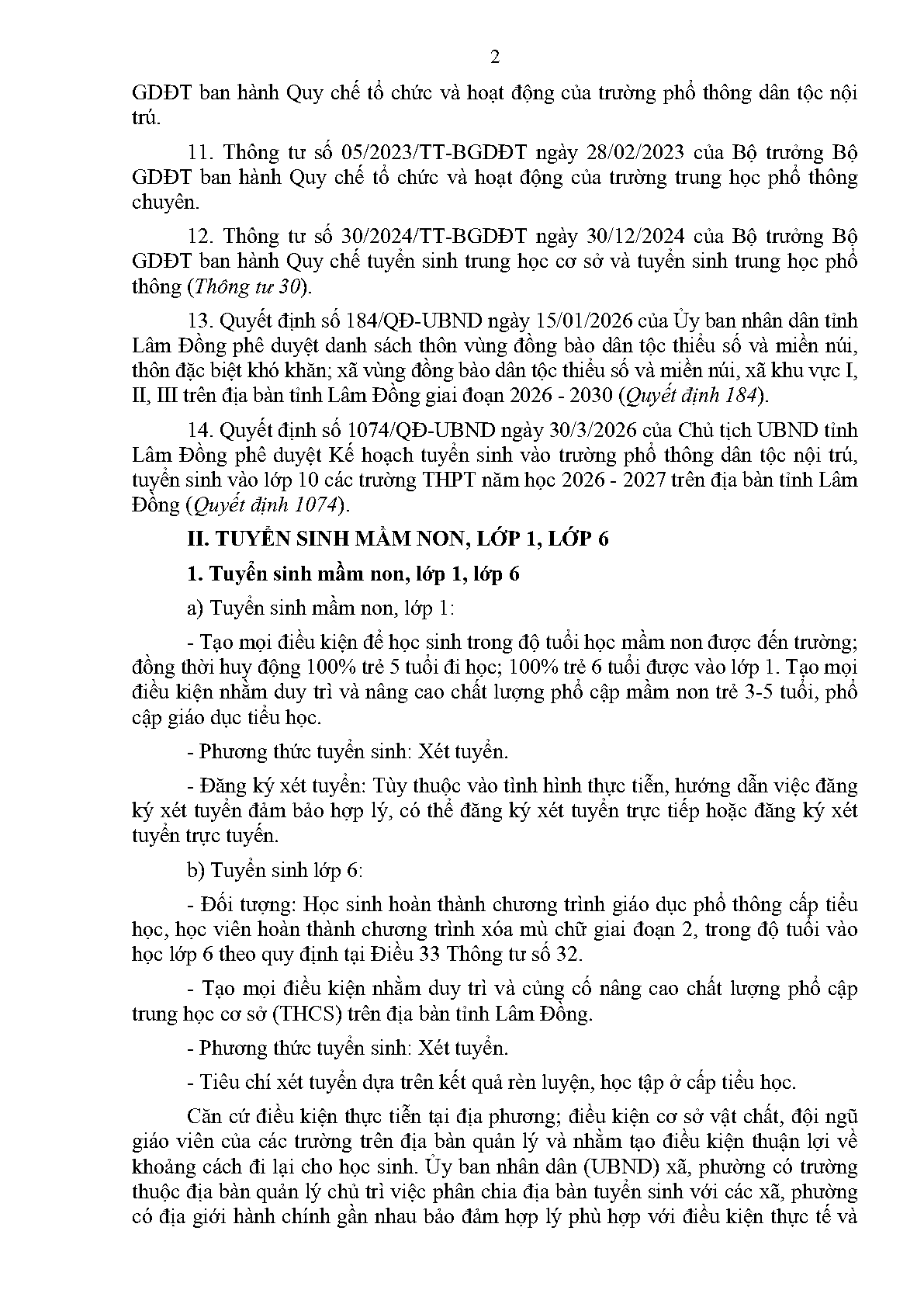 • Quyết định Phê duyệt Kế hoạch tuyển sinh vào trường phổ thông dân tộc nội trú, tuyển sinh vào lớp 10 các trường trung học phổ thông năm học 2026 – 2027 trên địa bàn tỉnh Lâm Đồng