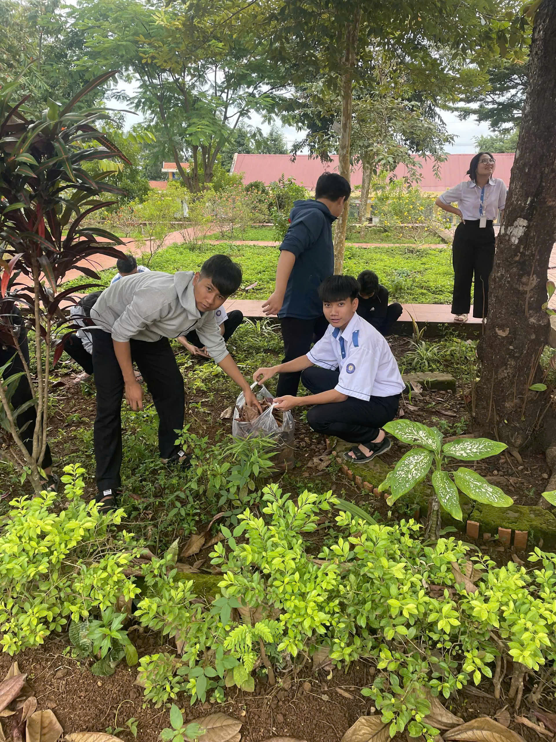 Nhà trường tập trung trồng các loại cây và hoa có kích thước nhỏ, dễ chăm sóc, chống chịu hạn tốt vào mùa khô, phù hợp cảnh quan như Hoa Trang, Hoa Hồng, Hoa Dâm Bụt, Ngũ sắc… Bố trí trồng và chăm sóc dọc hành lang, khu hành chính và khu vực sân trường. Đồng thời, sửa chữa, chăm sóc các bồn hoa và cây cảnh hiện có, bổ sung đất, phân bón, thay thế cây, hoa bị hư hại; nhờ đó, khuôn viên luôn xanh – sạch – đẹp, hài hòa và thân thiện.